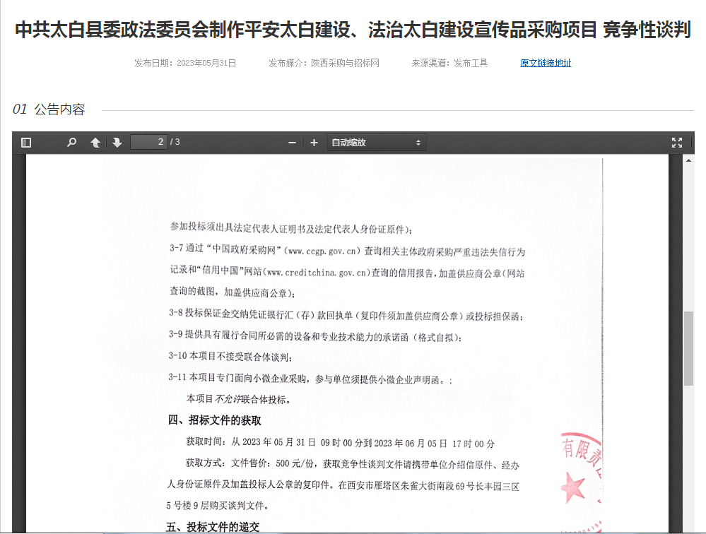 中共太白县委政法委员会制作平安太白建设、法治太白建设宣传品采购项目 竞争性谈判-谈判公告-陕西正邦招标有限责任公司
